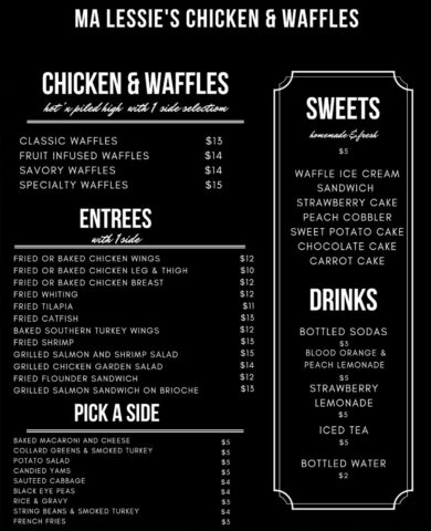 Ma Lessie’s menu includes flavorful comfort food, such as fried and baked chicken, waffles, a variety of fried fish, baked macaroni and cheese, collard greens and peach cobbler. The eatery’s name and menu are both inspired by Owner and West Philly native, Perry Ison’s grandmother.
